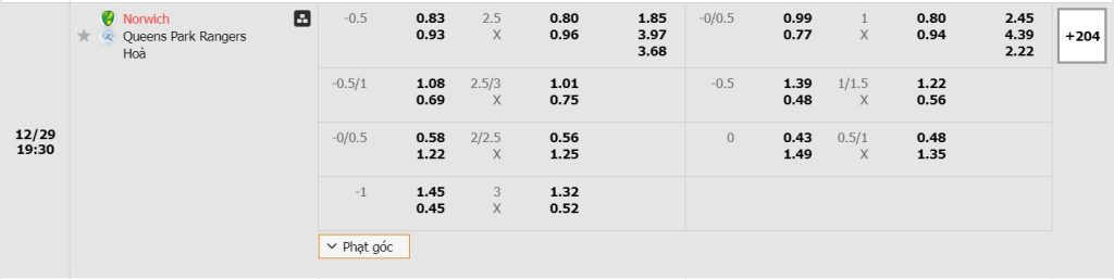 Bảng tỷ lệ kèo bóng đá trận đấu Norwich vs Queens Park Rangers