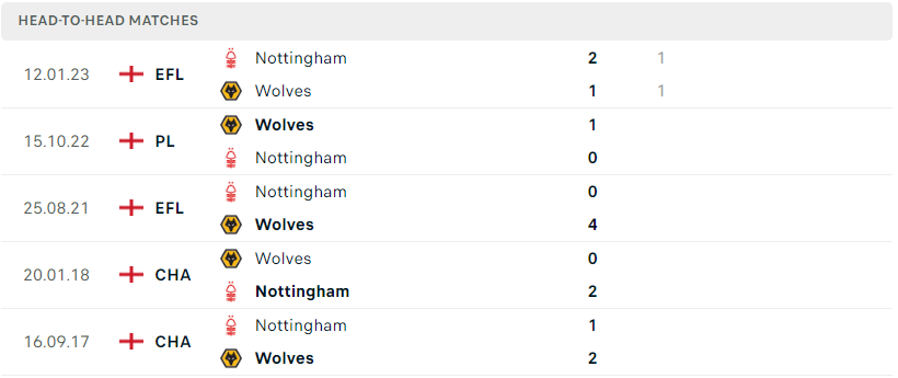 Thành tích đối đầu của Nottingham vs Wolves
