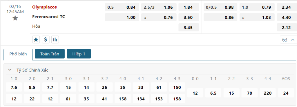 Bảng tỷ lệ kèo bóng đá trận đấu Olympiacos Piraeus vs Ferencvaros
