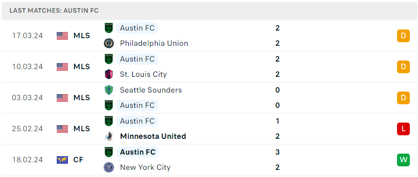 Phía bên kia, Austin FC cũng không quá hơn là mấy khi tập thể cũng chưa mang về được bất kỳ chiến thắng nào sau 4 vòng đấu. Mặc dù vậy, nhưng điều đáng mừng là họ cũng chỉ mới nhận về duy nhất 1 thất bại trước Minnesota United. Phong độ tương đối cập rập đang mang đến nhiều nổ lo dành cho người hâm mộ. Chuyến hành quân đến Orlando City sắp tới sẽ tiếp tục được dự báo là nhiệm vụ hết sức khó khăn nữa dành cho binh đoàn Josh Wolff.