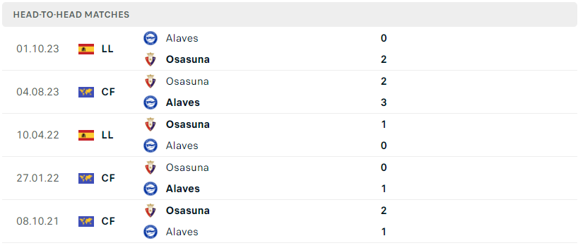 Thành tích đối đầu của Osasuna vs Alaves