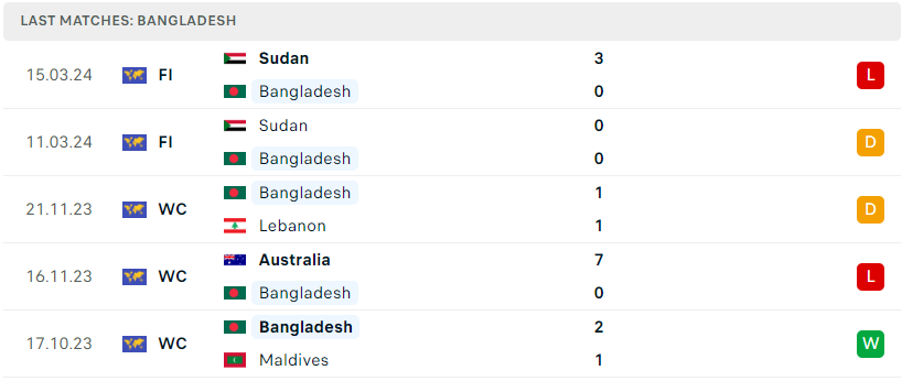 Phía bên kia, sau khi thuận lợi vượt qua vòng sơ loại thì Bangladesh đã nếm phải ngay vị đắng khi họ đã nhận thất bại múi mặt 0-7 trước ĐT Úc tại lượt trận đầu tiên ở vòng loại thứ 2. Đoàn quân Javier Cabrera hiện đang bị đánh giá là “kẻ lót đường” tại bảng I và trước khi bước vào chuyến hành quân đến Palestine thì tập thể này cũng vừa phải đón nhận 1 thất bại và 1 trận hòa trước Sudan. Vẫn còn rất nhiều việc phải làm nếu như Bangladesh đặt những tham vọng và mục tiêu cao hơn.