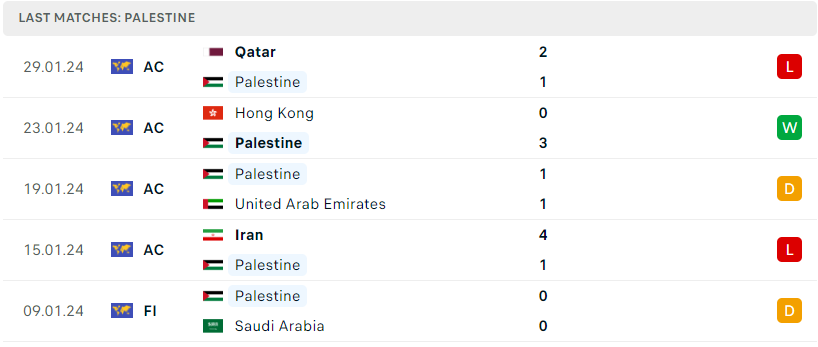 Trong quá khứ, hai đội đã có 6 lần đụng độ, thế nhưng Palestine đã mang về đến 5 chiến thắng và vẫn đang hoàn toàn bất bại. Một thống kê đủ để thấy sự lấn áp về mọi mặt của Palestine so với đối thủ trong những năm qua. Sự hưng phấn và nhuệ khí chiến đấu chắc chắn vẫn chưa giảm đi và điều này cộng kèm với lợi thế sân nhà sẽ giúp binh đoàn áo trắng thành công giành điểm.