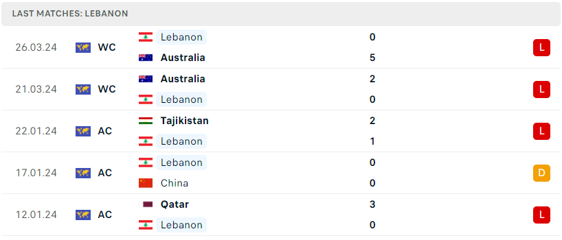 Không trái với dự đoán, Liban chính là một trong hai cái tên cùng với Bangladesh lót đường tại bảng đấu này. Dù mở màn bằng trận hòa đáng khen trước Palestine, tuy nhiên sự yếu kém của đội tuyển này ngay lập tức được thể hiện và thống kê cho thấy, Liban chỉ mang về duy nhất 1 bàn thắng sau 4 trận đấu và thậm chí đã nhận về đến 8 bàn thua. Đi kèm với sự yếu kém về lối chơi đó chính là sự non nớt. Phải hành quân đến sân của Palestine ở bối cảnh như hiện tại quả thật là thử thách vô cùng khó.