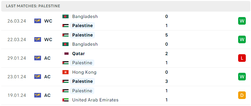 Thắng lợi tối thiểu trước Bangladesh ở lượt trận trước trong thế nắm giữ vô vàn những lợi thế có lẽ đã cho thấy rõ sự kỷ luật trong cách vận hành lối chơi của Palestine. Song song với đó, đội tuyển này cũng chỉ phải nhận về duy nhất 1 bàn thua. Chính vì lẽ đó, khả năng nổ tài trong trận đấu gần như là bất khả thi.