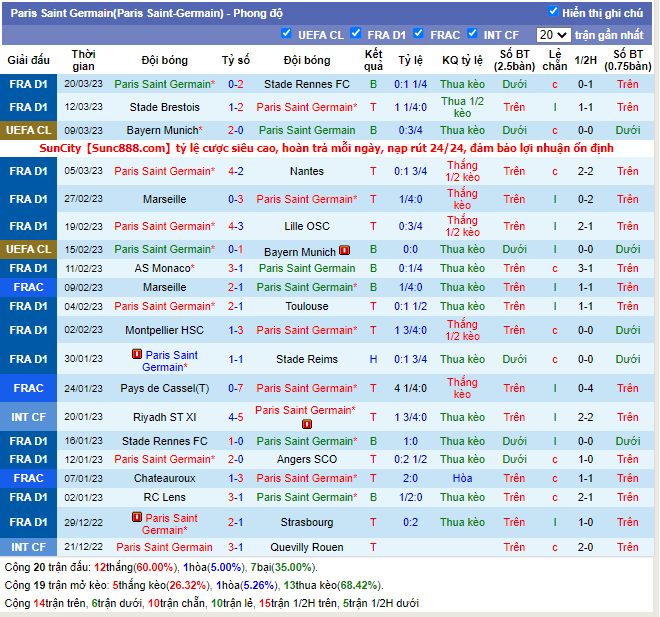 Phong độ đội bóng Paris Saint Germain vs Lyon