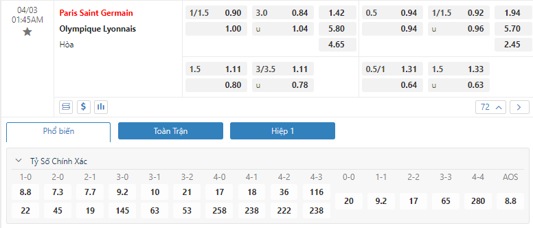 Soi kèo tài xỉu Paris Saint Germain vs Lyon