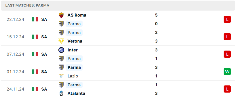 Tưởng chừng với thắng lợi không tưởng 3-1 trước Lazio, Parma đã le lói hy vọng trụ hạng, thế nhưng mọi thứ lại càng trở nên khó khăn hơn với đội bóng tân binh khi họ để thua liên tiếp 3 trận sau đó. Từ đầu mùa, Parma mới chỉ giành được 15 điểm và hiện chỉ hơn nhóm cầm đèn đỏ đúng 1 điểm. Có vẻ như lần trở lại này đang trở nên đặc biệt thử thách đối với họ. Hành trình trụ hạng chắc chắn sẽ không dễ dàng, và trận đấu tới với Monza sẽ là một cơ hội hiếm hoi để Parma nuôi hy vọng vượt khó.