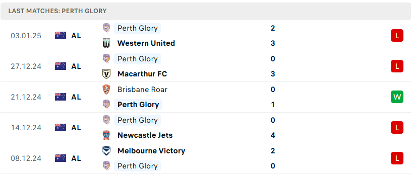 Bên kia, Perth Glory đang gặp vô vàn khó khăn ở mùa giải năm nay. Kể từ đầu mùa, họ chỉ giành được đúng 1 chiến thắng và phải nhận tới 8 thất bại. Thắng lợi duy nhất của tập thể này cũng chỉ đến từ cuộc đối đầu với đội bóng đang đội sổ BXH là Brisbane Roar. Lối chơi yếu kém, thiếu gắn kết và sự bất ổn kéo dài đã khiến Perth Glory trở nên mong manh. Việc đụng độ Auckland FC, đội bóng đang bay cao trên BXH, chắc chắn sẽ là một thử thách cực kỳ khó khăn đối với họ.