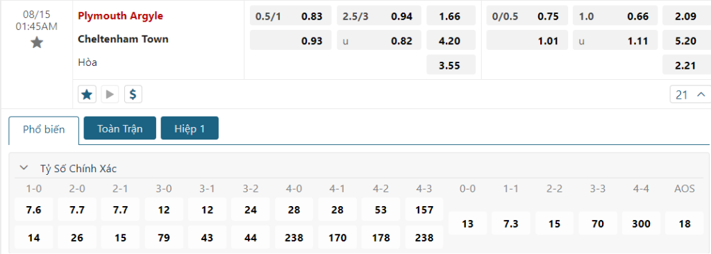 Bảng tỷ lệ kèo bóng đá trận đấu Plymouth Argyle vs Cheltenham Town