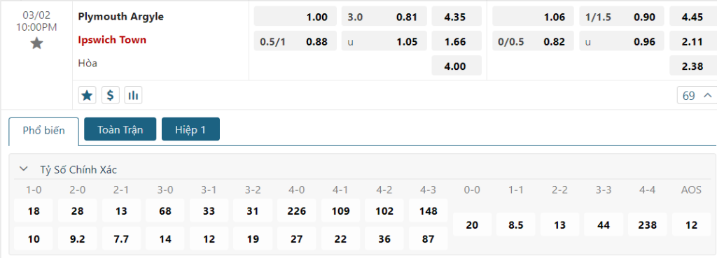 Kèo Châu Âu vẫn đang là sự nhỉnh hơn dành cho các vị khách, khi mức ăn của họ là 1.66 và con số này của Plymouth Argyle là 4.35. Một thời điểm mà Ipswich đang vượt trội cả về phong độ lẫn thực lực và độ hiệu quả trong lối chơi thì rõ ràng một thắng lợi sẽ khó thoát khỏi tầm tay của họ, dù ngay cả khi họ phải làm khách trong trận đấu kế tiếp.