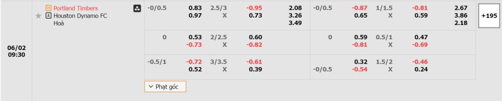 Bảng tỷ lệ kèo bóng đá trận đấu Portland Timbers vs Houston Dynamo