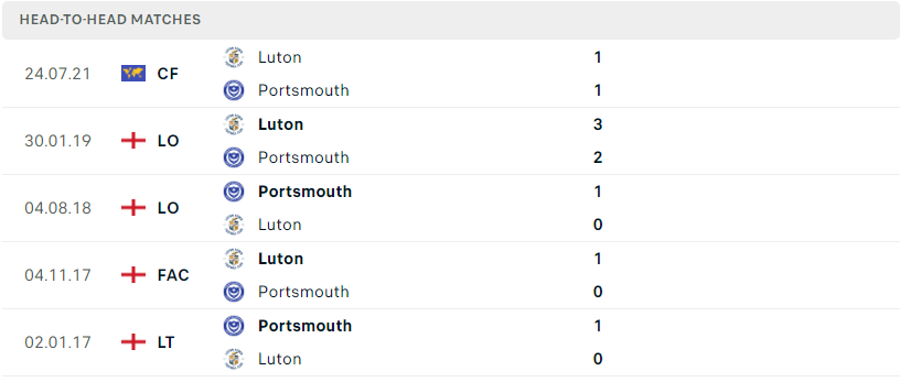 Thành tích đối đầu của Portsmouth vs Luton Town