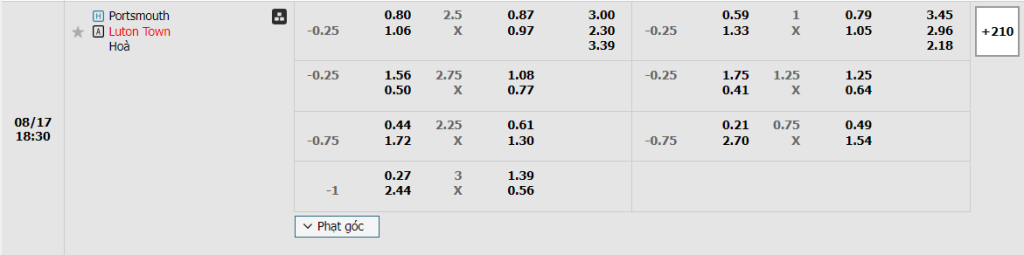 Kèo Châu Âu hiện vẫn đang là sự nhỉnh hơn dành cho Luton Town, khi mức ăn của họ là 2.30 và con số này của đội chủ nhà là 3.00. Trên thực tế, dù Portsmouth đã có màn ra quân ấn tượng ở lần đầu tiên mà tập thể chơi tại EFL, dù vậy nhưng trước sức mạnh và sự kinh nghiệm của Luton thì nghiểm nhiên thứ chờ đợi họ ở cặp đấu này vẫn sẽ là một thất bại khá sát nút.