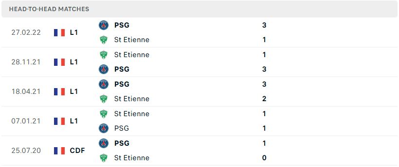 Thành tích đối đầu của PSG vs Saint Etienne