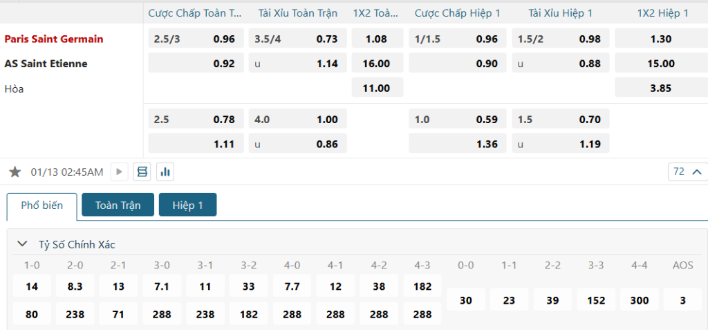 Sự áp đảo thêm một lần nữa được PSG thể hiện ở kèo đấu Châu Âu, nơi mức ăn của họ chỉ là 1.08, trong khi con số của Saint Etienne lên đến 16.00. Sự chênh lệch cực lớn đủ để khẳng định khả năng tạo bất ngờ của đội bóng tân binh là hoàn toàn không có cơ sở. Với sự khác biệt về năng lực, kinh nghiệm hay lợi thế sân nhà hiện có được, PSG chắc chắn sẽ không làm NHM phải thất vọng.