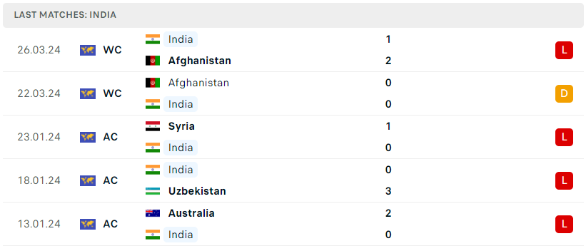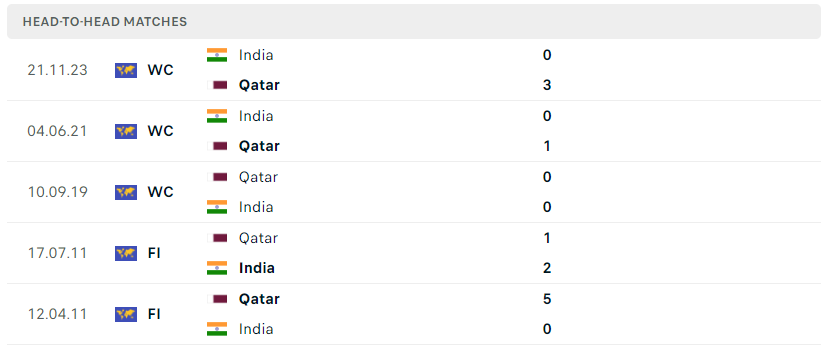 Thành tích đối đầu của Qatar vs Ấn Độ