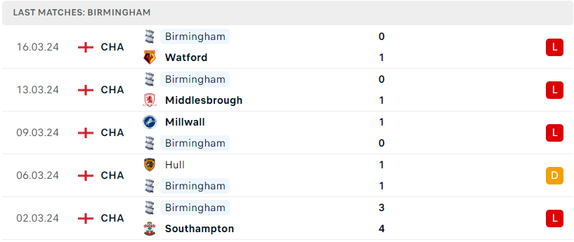 Tình hình của Birmingham ngày càng trở nên tồi tệ khi họ liên tục để thua trong khoảng thời gian qua. Thất bại trước Watford ở vòng đấu trước một lần nữa đã giáng đòn tâm lý nặng nề xuống tham vọng trụ hạng của đoàn quân Tony Mowbray. Chuyến hành quân đến QPR vào cuối tuần thuộc loạt trận vòng 39 sẽ là nhiệm vụ khó khăn nữa dành cho họ.