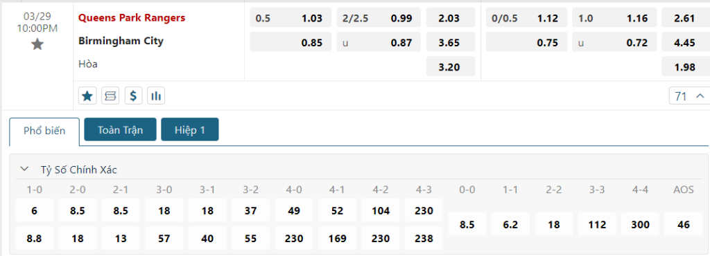 Kèo Châu Âu nghiễm nhiên vẫn là sự ưu ái dành cho QPR, một điều không hề bất ngờ và nhất là trong thời điểm Queens Park Rangers đang trở lại quá mạnh mẽ. Phong độ thua thiệt, lợi thế thua thiệt và những thống kê không quá nổi bật sẽ khiến Birmingham đánh mất hoàn toàn sự tự tin và đành ôm lấy trận thua thất vọng.
