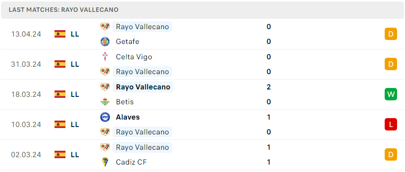 Lối chơi thực dụng của Vallecano tiếp tục phát huy tác dụng khi họ liên tục cầm hòa những đối thủ khó chịu và mới nhất là Getafe và Celta Vigo. Thống kê cho thấy, kể từ đầu mùa Rayo Vallecano chính là tập thể sở hữu số trận hòa nhiều nhất giải với 13 lần sau 31 vòng đấu. Hiện đoàn quân Inigo Pérez đang sở hữu 31 điểm và cũng chỉ hơn vị trí xuống hạng đúng 2 trận thắng. Tuy thời gian không còn nhiều, nhưng những rủi ro xuống hạng vẫn là có và họ bắt buộc phải duy trì được sự ổn định cần thiết.