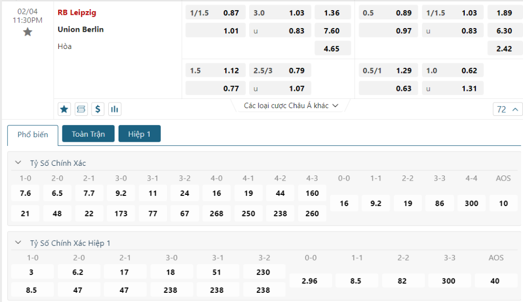 Kèo Châu Âu vẫn là sự áp đảo dành cho RB Leipzig khi mức ăn của họ chỉ là 1.36 trong khi con số này của các vị khách là 7.60. Một thời điểm hết sức khó khăn và hơn lúc nào hết RB Leipzig sẽ cần phải có những sự quyết tâm nhằm trở lại đường đua. Các lợi thế có được sẽ là cơ sở để họ có thể nghĩ đến một chiến thắng trước “kẻ khốn khổ” Union Berlin ở trận đấu sắp tới.
