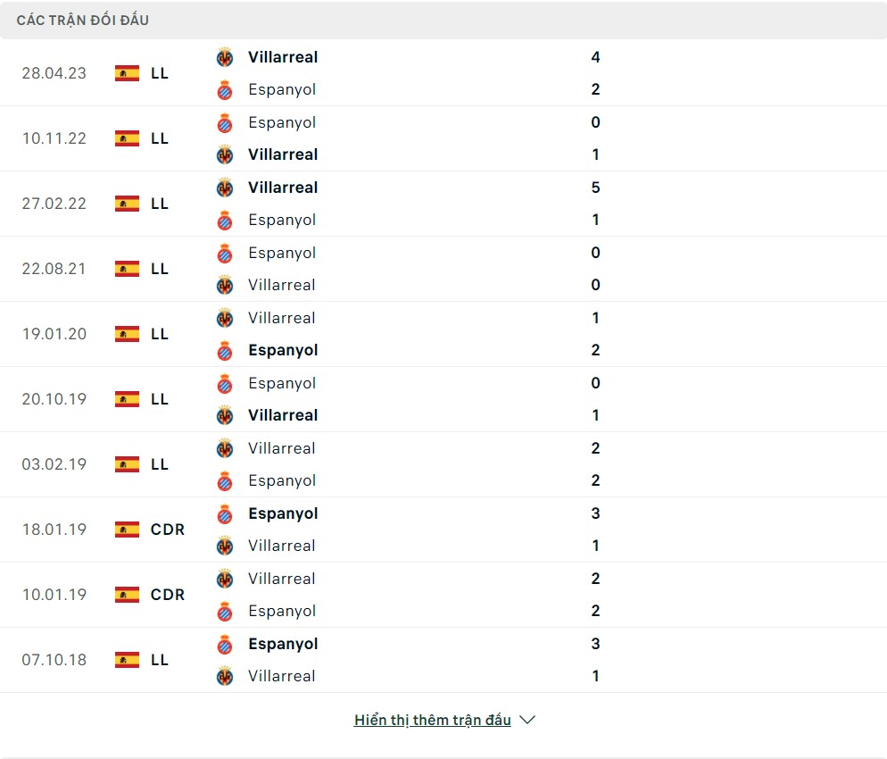 Lịch sử thi đấu của RCD Espanyol vs Villarreal