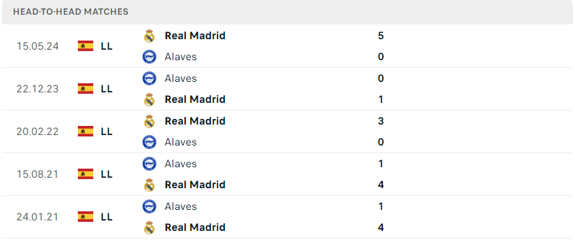 Thành tích đối đầu của Real Madrid vs Alaves