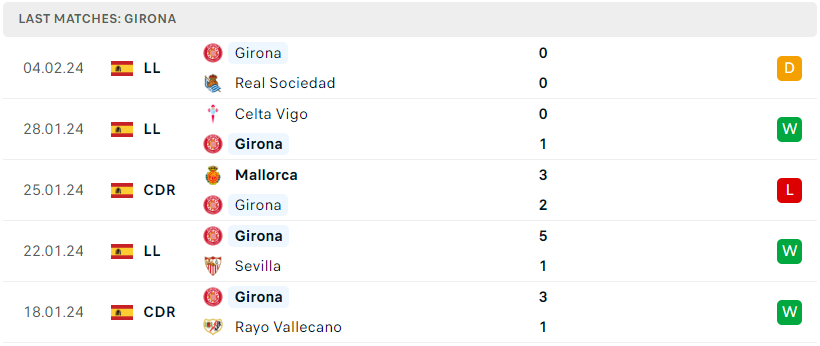 Phía bên kia, Girona cũng vừa để cho Real Sociedad cầm chân đầy thất vọng ít ngày trước. Dù đang được đánh giá là một trong những ứng viên nặng ký cho chức vô địch nhưng “hiện tượng” Girona vẫn chưa thể duy trì được sự ổn định cần thiết. Thống kê cho thấy, trong 5 vòng đấu gần nhất tại La Liga thì họ cũng chỉ mới mang về 3 chiến thắng. Dù cách biệt về điểm số giữa họ và Real Madrid chỉ là 2 điểm, tuy nhiên nếu không có được kết quả thuận lợi trong trận “chung kết” này thì cơ hội để họ bứt phá là rất mong manh.