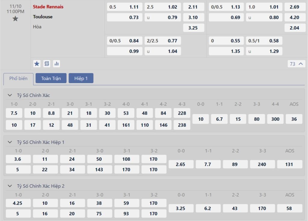 Được thi đấu trên sân nhà cùng thực lực được đánh giá cao hơn so với đối thủ nên không ngạc nhiên nếu Rennes được đánh cao hơn so với Toulouse trong trận đấu này. Sàn giao dịch châu Á chứng kiến mức kèo chấp 0.5 trái với tỷ lệ cho kèo trên lên tới 1.11, chênh lệch không quá lớn. Thế nhưng nó cũng cho thấy cơ hội dành cho thầy trò Julien Stephan đang là nhiều hơn so với các vị khách. Rennes có thể gây thất vọng khi mới có 3 chiến thắng, 2 trận hòa cùng 5 thất bại nhưng nên nhớ tại Stade de la Route de Lorient, họ mới thua 1/5 lần đón khách từ đầu mùa. Sân nhà chính là sức bật cho mục tiêu 3 điểm. Trong khi đó, Toulouse chỉ mới chấm dứt mạch không thắng trên sân khách khi đánh bại một Montpellier đang khủng hoảng. Chẳng có gì đảm bảo cho mục tiêu có điểm của thầy trò HLV Carles Martinez.