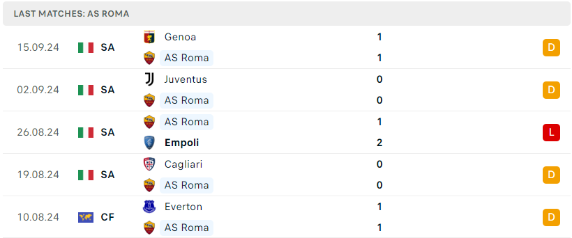 Sau một mùa giải không mấy thành công, AS Roma đã bị đặt rất nhiều dấu hỏi lớn ở mùa giải mới và điều này ngay lập tức đúng khi đoàn quân De Rossi đang trình diễn một bộ mặt cực kỳ bạc nhược từ đầu mùa. Thống kê cho thấy, sau 4 trận đấu Giallorossi không mang về bất kỳ chiến thắng nào, đáng nói những đối thủ mà họ phải chạm mặt đều là những đội bóng trung bình yếu. Một thời điểm đặc biệt khó khăn và binh đoàn thủ đô buộc phải sớm khôi phục lòng tin nơi NHM.