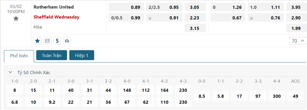Không quá bất ngờ khi kèo Châu Âu vẫn đang là sự lấn lướt dành cho Sheffield Wed, khi mức ăn của họ đang là 2.23 trong khi con số này của đội chủ nhà là 3.05. Trong một thời điểm mà cả phong độ lẫn trình độ của các vị khách là hoàn toàn ăn đứt Rotherham vào lúc này thì tin chắc rằng 3 điểm sẽ khó thoát khỏi tầm tay của đoàn quân Carlos Carvalhal.