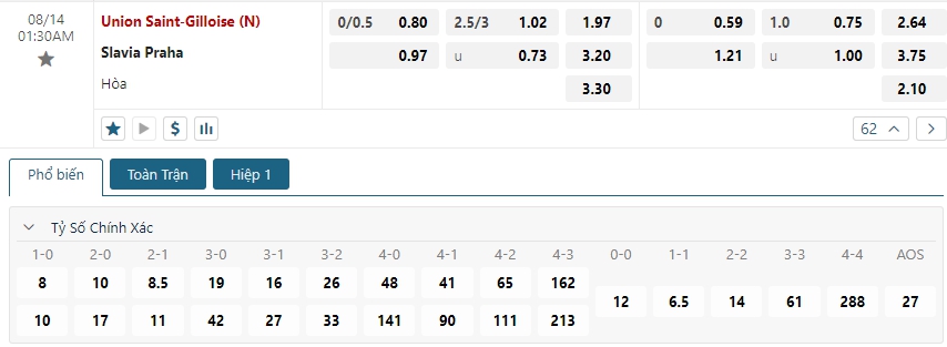 Bảng tỷ lệ kèo bóng đá trận đấu Royale Union SG vs Slavia Prague