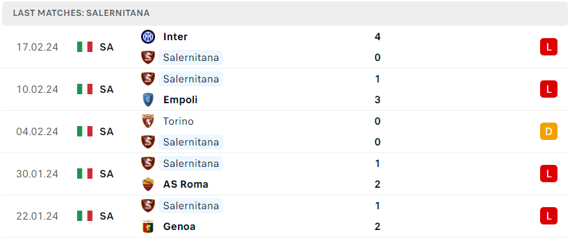 Càng thi đấu Salernitana càng cho thấy họ đích thực là một trong những cái tên có nguy cơ lớn phải xuống hạng ở mùa giải năm sau. Thống kê cho thấy, trong 8 lần ra sân gần nhất tại Serie A thì đoàn quân Fabio Liverani đã nhận về đến 7 thất bại và xa hơn thì họ cũng chỉ thắng 2 sau 25 vòng đấu kể từ đầu mùa. Chuỗi thành tích bết bát vừa qua đang khiến cho tập thể này hiện cách vị trí an toàn lên đến 7 điểm. Với tình trạng như hiện tại thì màn tiếp đón Monza sắp tới đây chắc chắn sẽ không phải là nhiệm vụ dễ dàng.