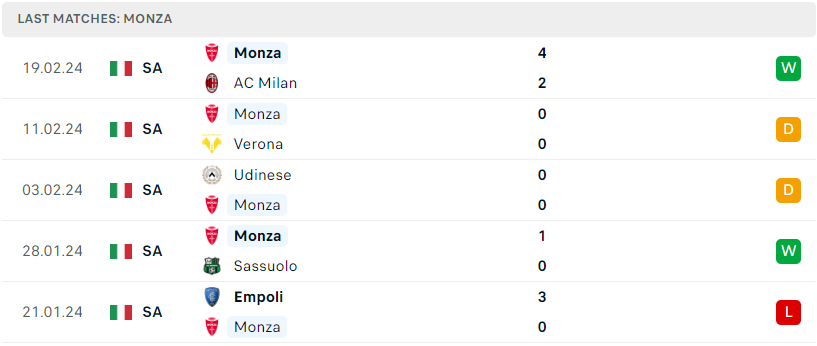 Phía bên kia, Monza tiếp tục để lại dấu ấn bằng thắng lợi giòn giã 4-2 trước AC Milan ở vòng đấu trước. Điểm rơi phong độ của đoàn quân Raffaele Palladino vào lúc này là cực kỳ ấn tượng với chuỗi 4 trận bất bại liên tiếp. Dù đây chỉ mới là mùa giải thứ 2 mà Monza góp mặt tại hạng đấu cao nhất nước Ý, tuy nhiên với lối đá hiệu quả và đầy tiềm năng như hiện tại thì tập thể vùng Lombardia chắc chắn sẽ còn tiến bộ và phát triển hơn trong tương lai.