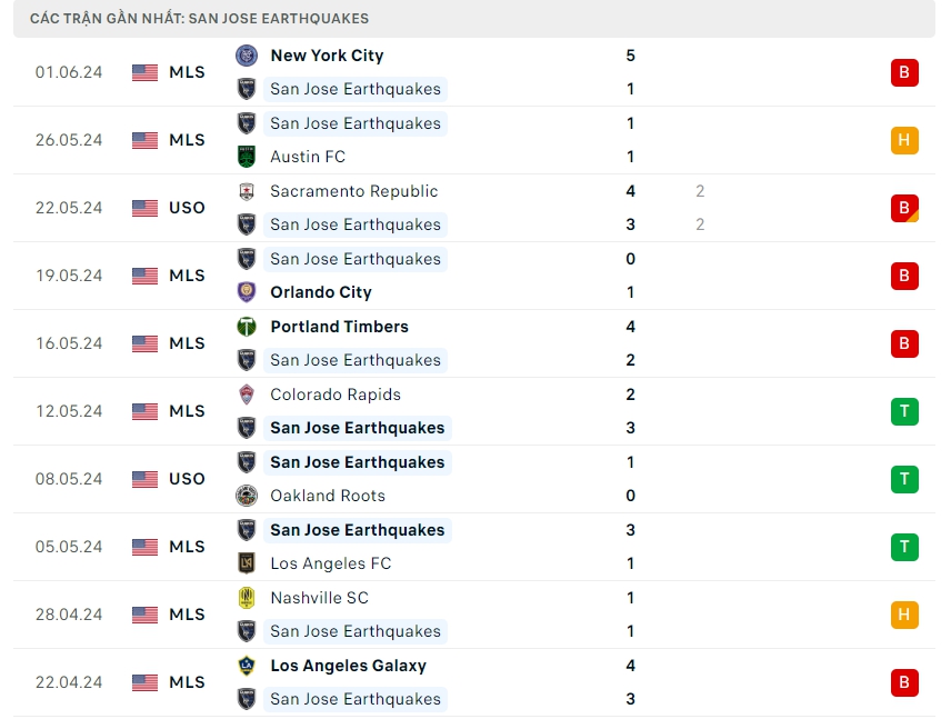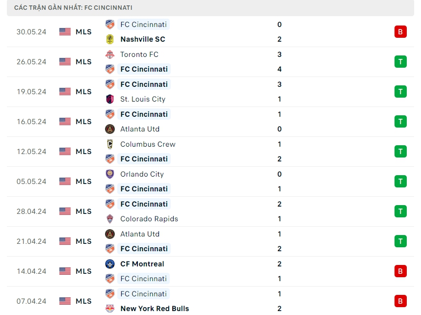Phong độ đội bóng San Jose Earthquakes vs FC Cincinnati