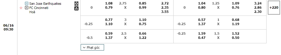 Bảng tỷ lệ kèo bóng đá trận đấu San Jose Earthquakes vs FC Cincinnati