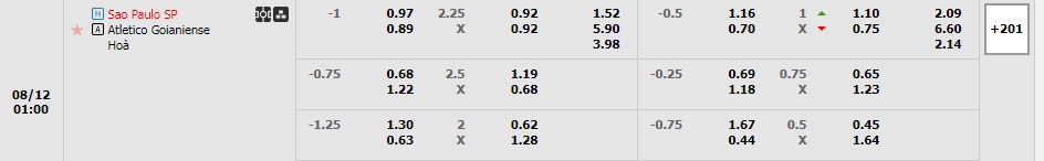 Bảng tỷ lệ kèo bóng đá trận đấu Sao Paulo vs Atletico Goianiense