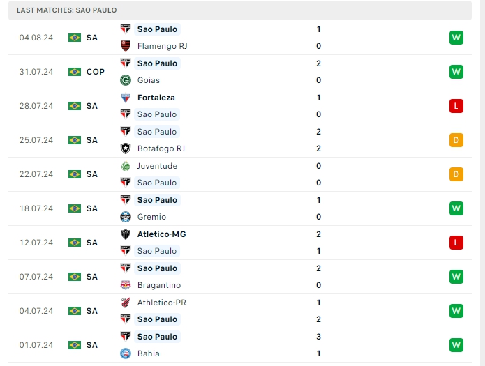 Sao Paulo vừa có chiến thắng trước Flamengo RJ, chiến thắng này là trận thắng thứ 2 liên tiếp của họ, trải qua 21 lượt trận với 35 điểm có được, Sao Paulo đang xếp vị trí thứ 6 trên BXH, hàng công của Sao Paulo thi đấu khá tốt với 29 bàn thắng , bên cạnh hàng thủ nhận 21 bàn thua, 5 trận gần nhất được thi đấu trên sân nhà của mình hàng công của Sao Paulo có được 8 bàn thắng và hàng thủ chơi khá chắc chắn với chỉ 2 bàn thua phải nhận. 4/5 trận gần nhất trên sân nhà của mình khép lại 90 phút không quá 3 bàn.