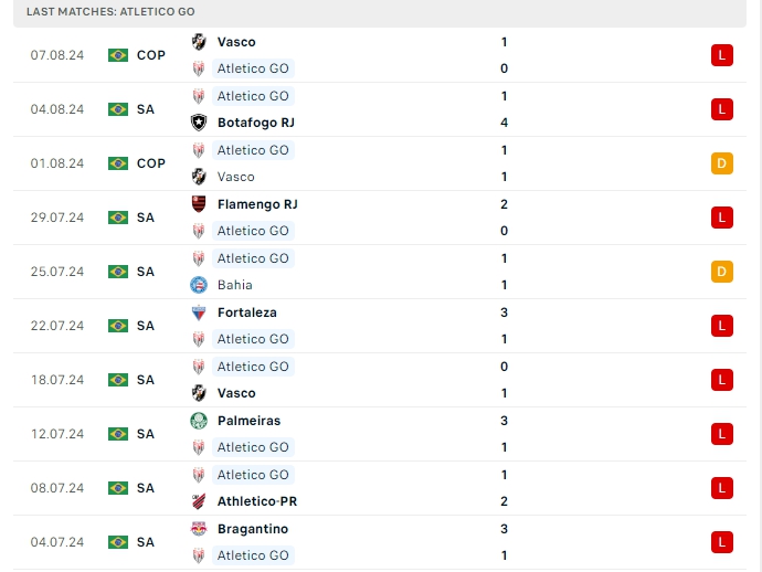 Trong khi đó với Atletico Goianiense, đội bóng này đang có những màn trình diễn tệ hại, với 2 chiến thắng, 6 hòa và 13 thất bại sau 21 lượt trận, họ có cho mình 12 điểm và đang xếp cuối cùng trên BXH, thất bại gần nhất trước Botafogo RJ là trận không thắng thứ 14 liên tiếp của họ, hàng công của Atletico Goianiense thi đấu tệ với 17 bàn thắng có được, cùng với hàng thủ thi đấu thiếu chắc chắn khi chỉ nhận 35 bàn thua, 5 trận gần nhất phải thi đấu xa nhà, hàng công của Atletico Goianiense có cho mình 3 bàn thắng và hàng thủ nhận 12 bàn thua.