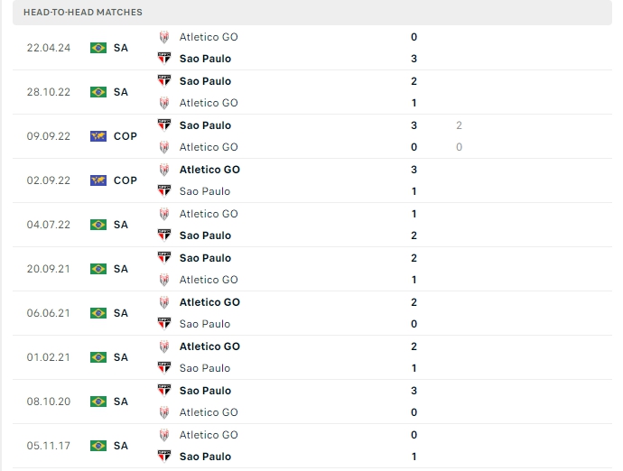 Lịch sử thi đấu của Sao Paulo vs Atletico Goianiense