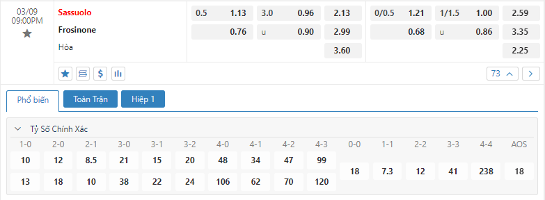 Kèo châu Âu cũng đang là sự ưu thế cho đội chủ nhà khi mức ăn của Sassuolo đang là 2.13 trong khi đó con số này của Frosinone đã là 2.99. Một khoảng thời gian vô cùng khó khăn và hơn lúc nào hết Sassuolo sẽ cần phải có được sự quyết tâm vươn lên cùng với đó là những giải pháp để đưa mình trở lại với guồng quay hiện tại. Các lợi thế đang có sẽ là cơ sở để họ có thể nghĩ đến một chiến thắng trước Frosinone ở trận đấu tới.