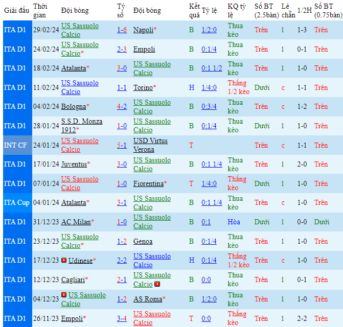 -Phong độ Sassuolo