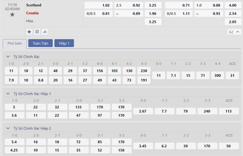 Dù được chơi trên sân nhà nhưng với thực lực cùng chất lượng đội hình thua kém, không bất ngờ khi Scotland là những người được xếp “nằm dưới” so với Croatia. Sàn giao dịch châu Á chứng kiến mức kèo khách chấp 0.25 trái. Đây là mức kèo không cho thấy sự khác biệt quá lớn nhưng một phần là do đội quân của HLV Steve Clarke được chơi trên sân nhà. Như đã nói, Scotland sau 4 lượt trận mới có duy nhất 1 điểm và thời gian trụ lại nhóm A chỉ còn được đếm bằng ngày. Trong khi đó Croatia có thể đang “già cỗi” giống như nhạc trưởng Luka Modric nhưng nên nhớ “gừng càng già thì càng cay” và đoàn quân của HLV Zlatko Dalic được kỳ vọng vẫn biết cách thể hiện đẳng cấp đúng lúc để có một chiến thắng qua đó tiến một bước dài hoặc rất có thể sẽ chính thức giành vé vào tứ kết nếu Ba Lan không thắng Bồ Đào Nha.