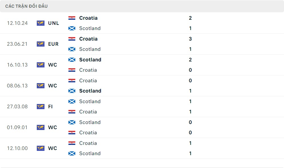 Lịch sử thi đấu của Scotland vs Croatia