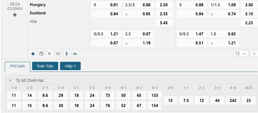 Kèo châu Âu đang đánh giá tỷ lệ chiến thắng của hai đội là khá cân bằng, khi mức tỷ lệ của Scotland là 2.55 và đối thủ của họ Hungary đang là 2.50. Scotland sẻ nhập cuộc với sự tự tin và động lực lớn khi vừa có trận hòa quan trọng trước Thụy Sỹ, trong khi Hungary đang tỏ ra là đối thủ yếu nhất bảng đấu khi dễ dàng bị đánh bại ở 2 trận đã qua, một trận đấu mà niềm tin sẻ đặt vào các cầu thủ Scotland sẻ an toàn hơn.