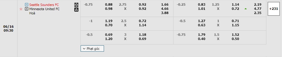 Bảng tỷ lệ kèo bóng đá trận đấu Seattle Sounders vs Minnesota Utd