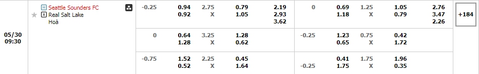 Bảng tỷ lệ kèo bóng đá trận đấu Seattle Sounders vs Real Salt Lake
