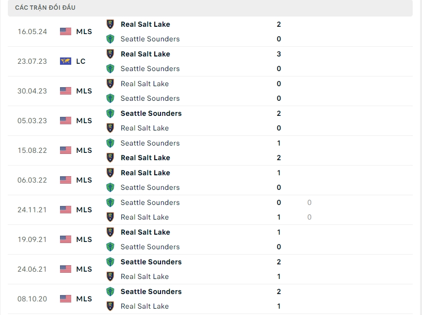 Lịch sử thi đấu của Seattle Sounders vs Real Salt Lake