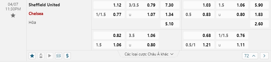 Sự ưu thế vẫn đang nghiêng về phía The Blues trong kèo Châu Âu, khi mức ăn của họ đang thấp hơn đáng kể so với đội chủ nhà (1.34 so với 7.30). Nhìn chung việc đang áp đảo trên các phương diện đội hình lẫn phong độ thi đấu sẽ tạo ra một đà tâm lý rất tốt để Chelsea hoàn toàn có thể làm chủ được trận đấu sắp tới. Sẽ là một kèo đấu mà Chelsea được kì vọng sẽ có thể dễ dàng có được 3 điểm trước Sheffield Utd .