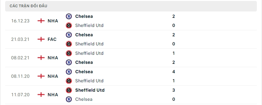 Lịch sử thi đấu của Sheffield Utd vs Chelsea
